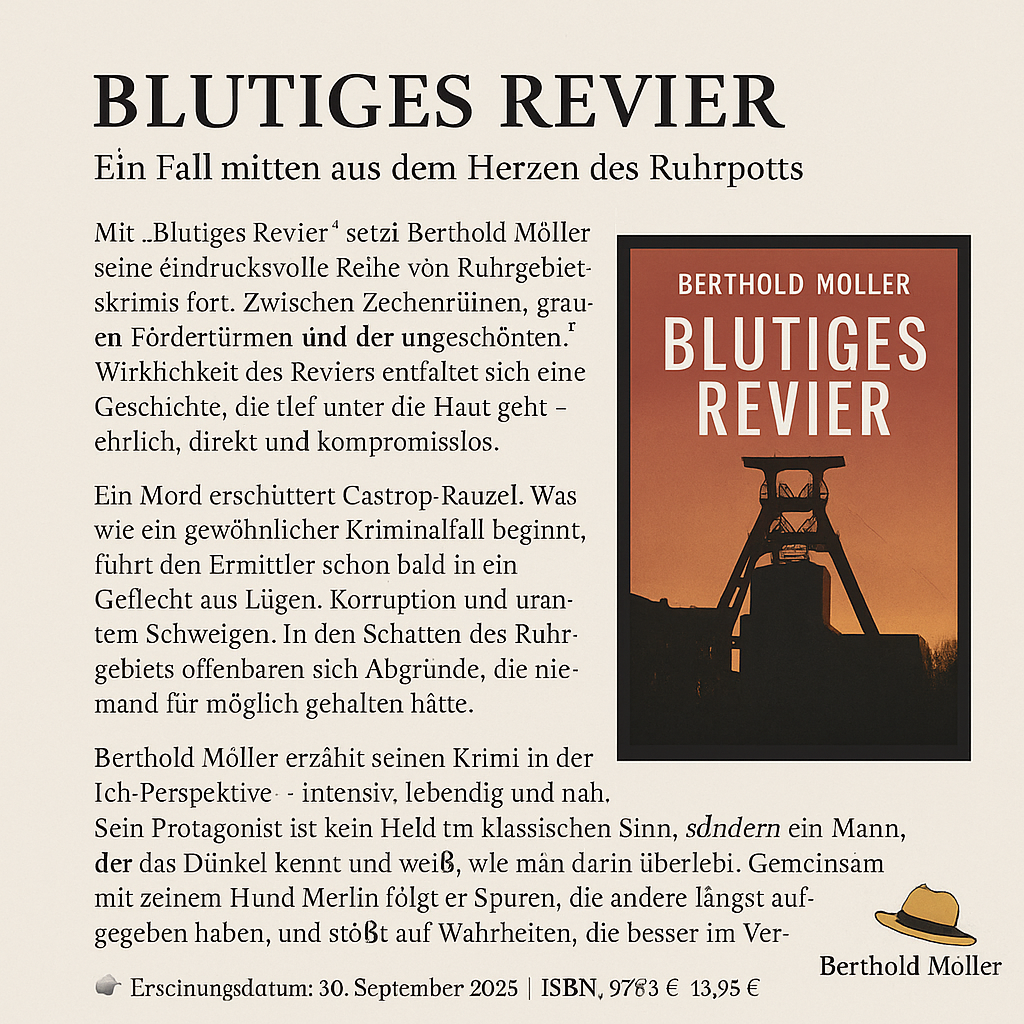 Mit „Blutiges Revier“ setzt Berthold Möller seine eindrucksvolle Reihe von Ruhrgebietskrimis fort. Zwischen Zechenruinen, grauen Fördertürmen und der ungeschönten Wirklichkeit des Reviers entfaltet sich eine Geschichte, die tief unter die Haut geht – ehrlich, direkt und kompromisslos.